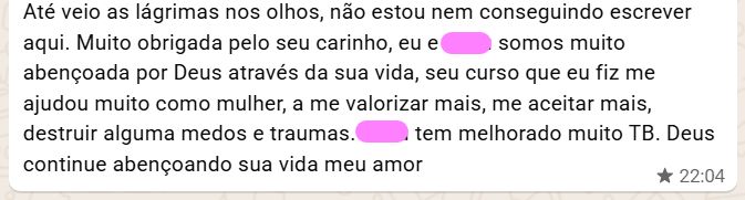 Você jamais verá algo parecido com isso aqui. São 8 anos de experiência específica com mulheres, mergulhando em seus interesses, medos, sentimentos, costumes, emoções, traumas. Atendimentos psicoterapêuticos em várias idades e contextos sociais. O que compartilho não é apenas conhecimento teórico, são princípios que já utilizo em mulheres a muito tempo, vendo cada uma delas florescer de forma extraordinária. Será uma jornada completa, que te ajudará de forma integral, cuidando de todas a áreas de sua vida de uma vez por todas!